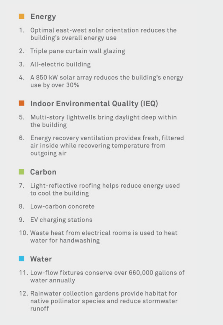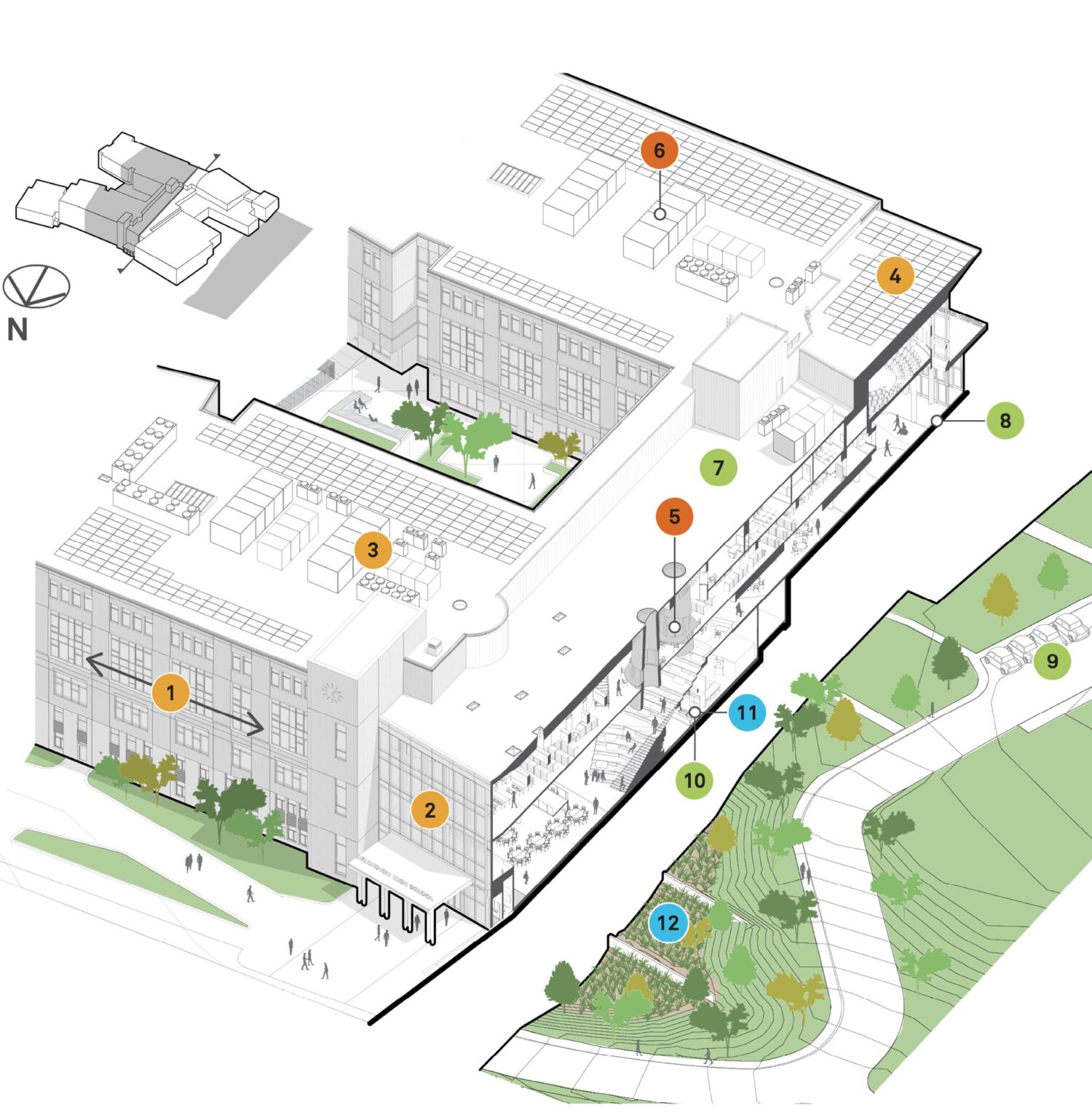 As an all-electric facility, no fossil fuels are burned on site to operate the building. With strategies including the use of low-carbon concrete, the school achieves a 9% reduction in embodied carbon relative to baseline. The use of Air-Source Heat Pumps, which supply fossil fuel free space heating and cooling, paired with careful zoning of the building based on educational and community program needs, limits the hours of operation for these units and significantly reduces the school’s energy use.
