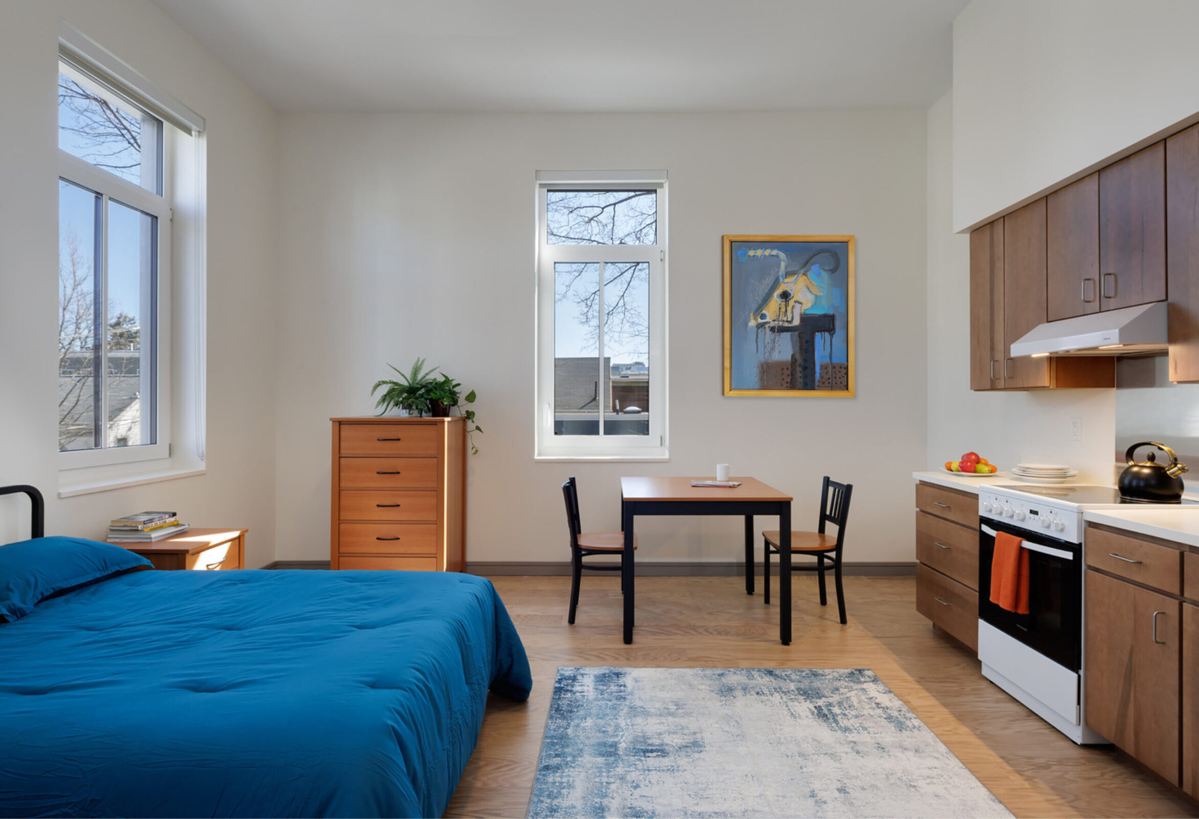 Between the original building’s 37 renovated units and the addition’s 25 new units, Dan’s Place now houses 62 residents in completely self-sufficient, move-in ready studio apartments featuring modern kitchens, private baths, high ceilings, tall windows, furniture, and household items.