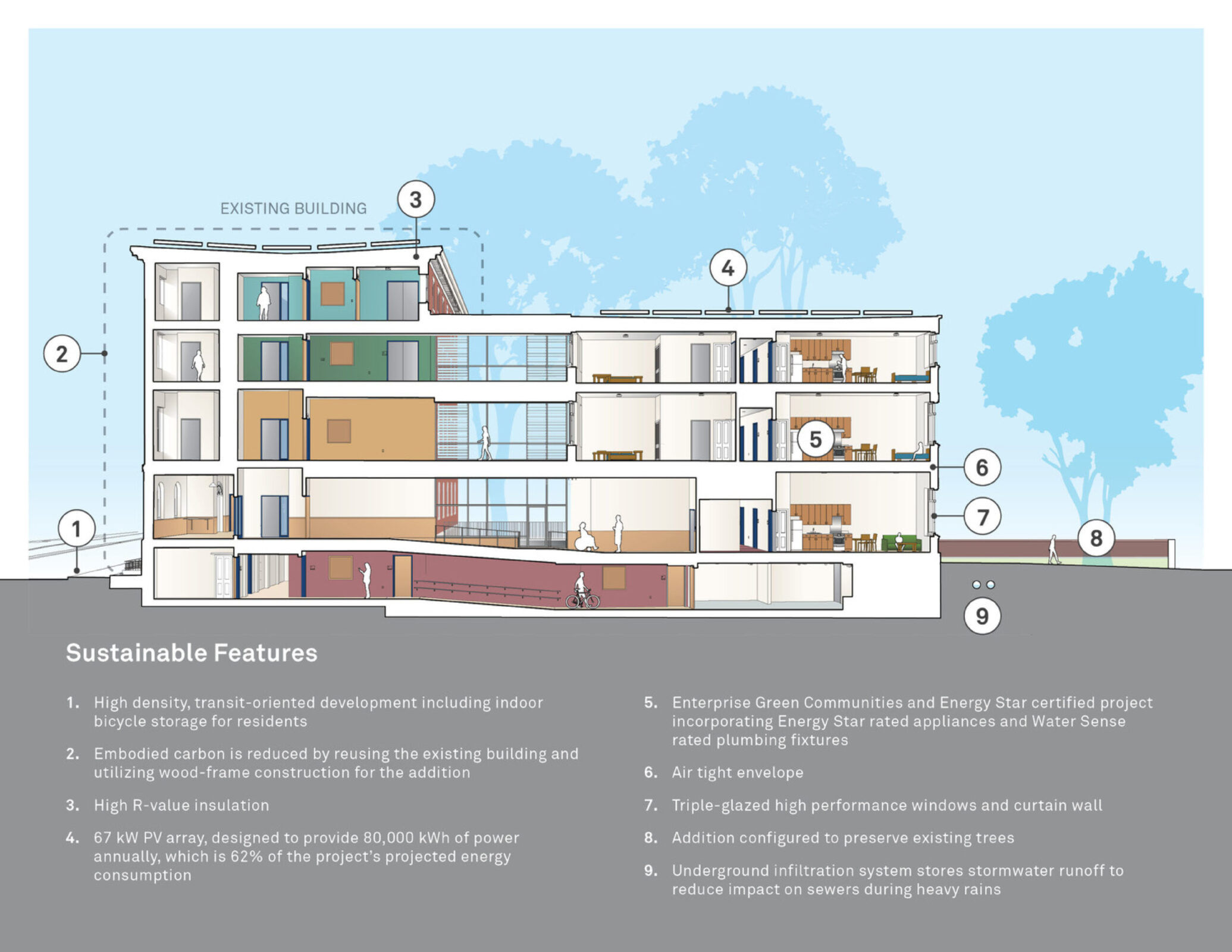 - From the airtight envelope and resilient flooring to the rooftop design and preserved trees, minimizing the project’s carbon footprint was considered in every detail.