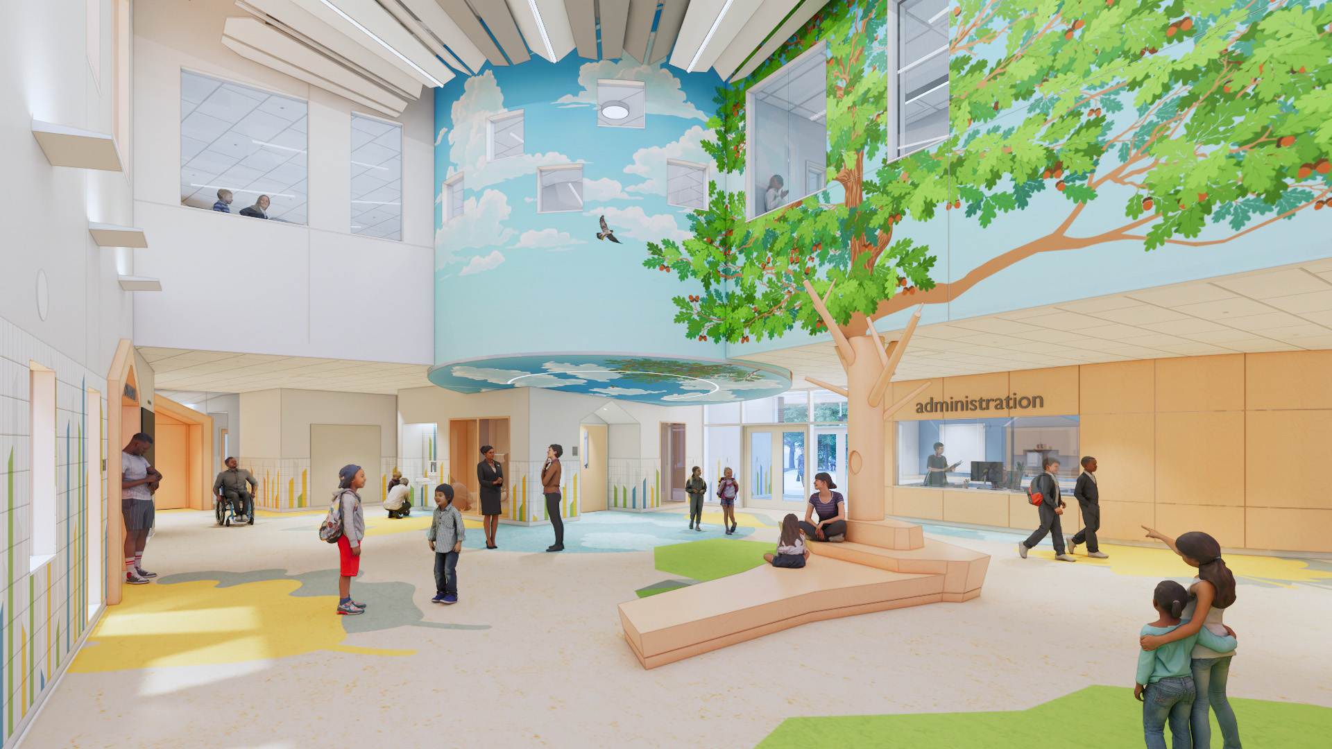 Students enter a light-filled lobby characterized by its biophilic design, featuring whimsical elements from environmental graphics to nature-inspired flooring and tile patterns. Geometric wooden portals mark the entrances to shared spaces including the gymnasium, music room, and a cafetorium, which are easily accessible from the lobby.