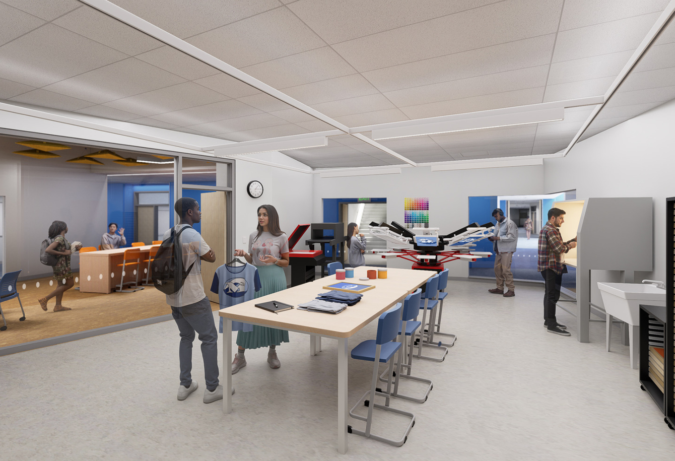With this project, Middletown has expanded its high school career technical education (CTE) programs in computer science, health careers, and manufacturing technology with state-of-the-art labs, makerspaces, and shops that open to outdoor learning spaces for large-scale projects. High school CTE spaces, middle school STEM classrooms, and art rooms for both levels are located directly off of the school’s main thoroughfare, creating a CTE-STEAM spine that promotes hands-on, career-focused learning opportunities at all levels.