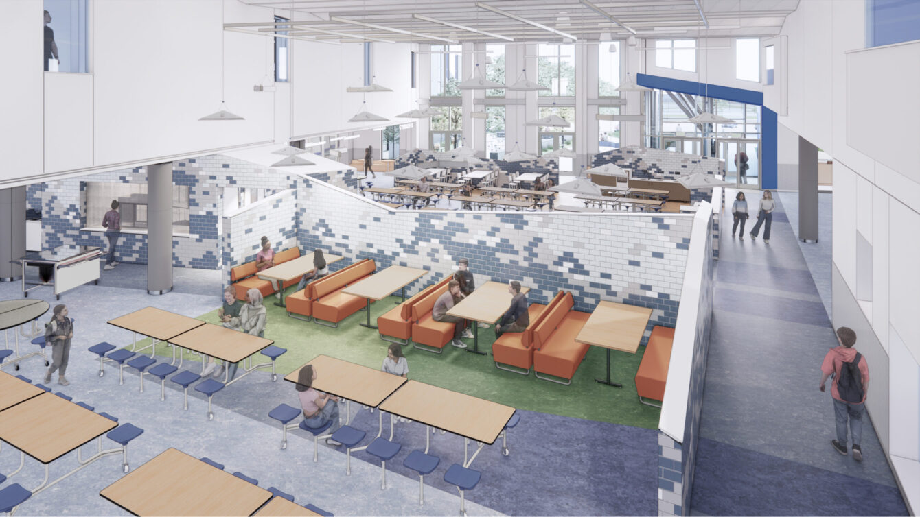 Home to the school’s public-facing amenities including dining areas, a media center, performance spaces, and athletic facilities, the central core is characterized by its tall ceilings, expansive windows, and tile murals, creating a bright and welcoming environment for students and the Middletown community.